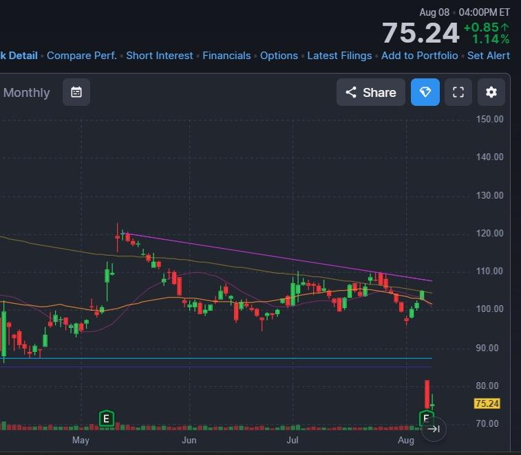 주가는 8월 7일 급락으로 2022년 이후 최저가를 기록했고, 200주 이동평균선 부근에서 단기 반등 중입니다. 그러나 거래량 급증과 함께 발생한 대폭락은 기술적으로 **“하락 후 약세 지속형 패턴”**의 전형적인 신호일 수 있습니다. 단기 매물대는 $78~80 구간에 집중되어 있으며, 해당 구간 돌파에 실패할 경우 재차 $70 이하를 테스트할 가능성도 존재합니다. 반대로 $80 이상에서 안착 시, 단기 저점 확인 신호로 해석될 수 있습니다.
