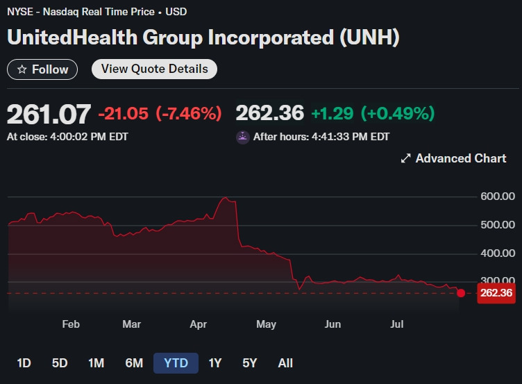 2025년 7월 29일 실적발표 이후 -7이상으로 장을 마감했으며, 2025년 들어 현재까지 누적 주가 하락률은 약 44%에 달하고 있습니다. 이는 다우존스 산업평균지수 구성 종목 중 가장 부진한 성과입니다. 방어주로 인식되던 보험업종 전반에 대한 투자자들의 신뢰가 흔들리는 가운데, UNH는 시장 내 위치를 재정립할 필요에 직면한 상태입니다.